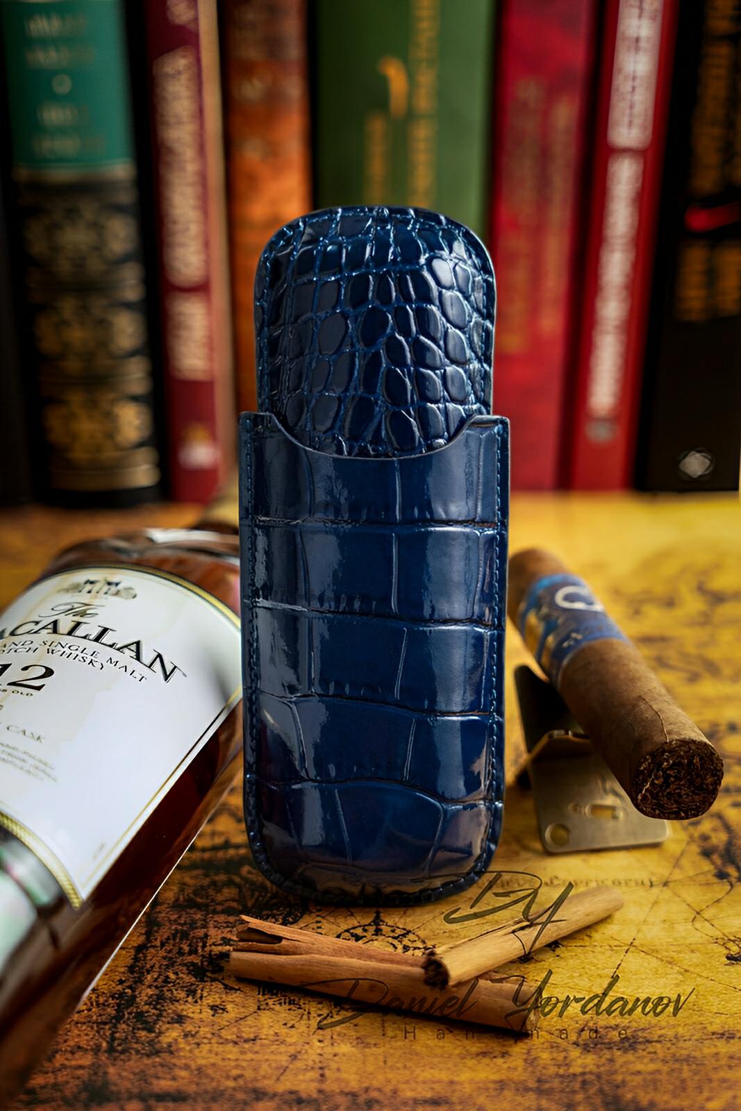 Двоен калъф за пури - Гланцов тъмносин крокодил